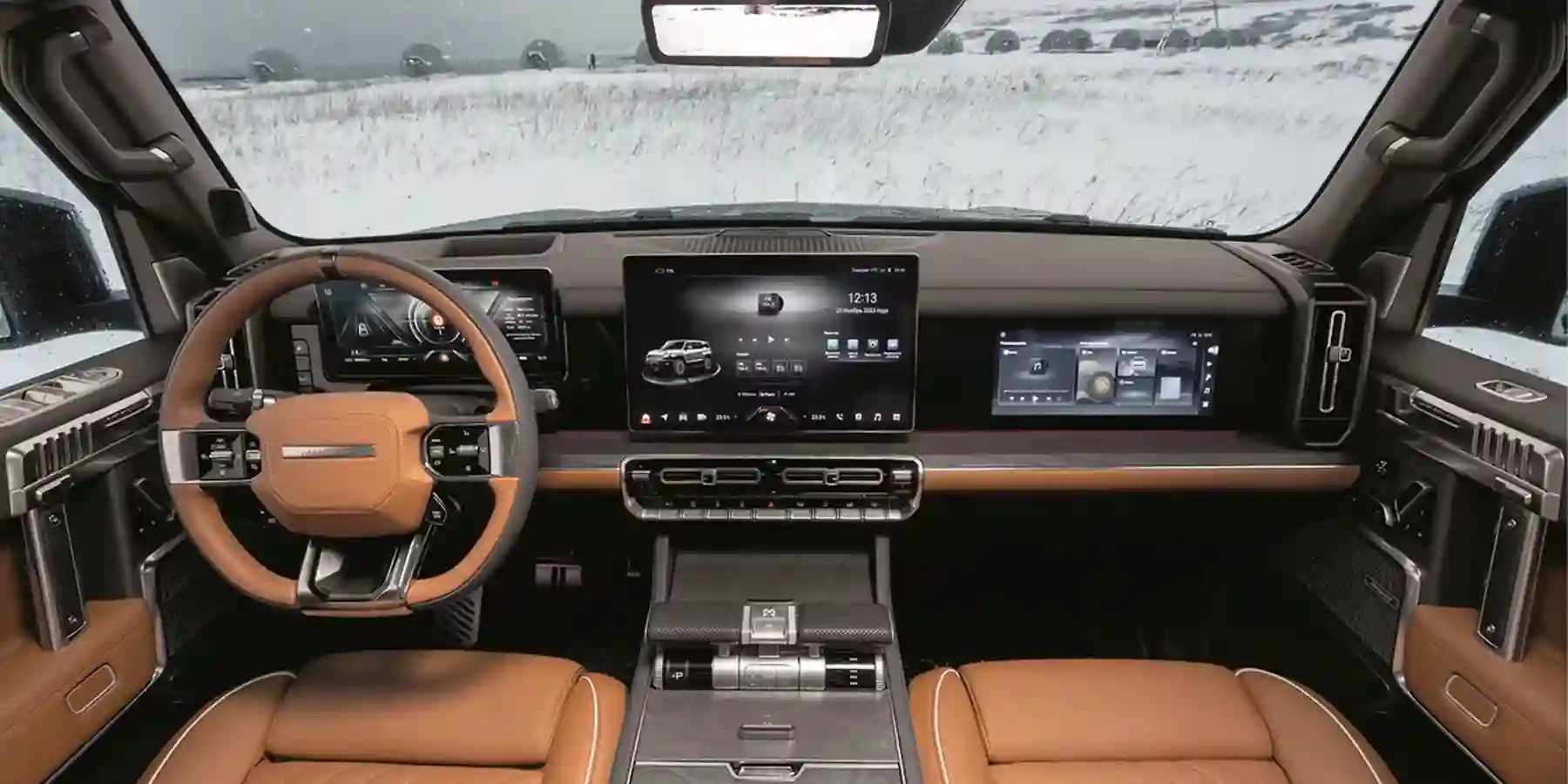 Вообще, у M-Hero, несмотря на наличие аж четырех дисплеев, достаточного много физических органов управления. Самый крупный из них — массивный контроллер переключения режимов движения на центральном тоннеле. В левой его части — выбор режимов движения автоматической коробки, отображение смены передач листается механически — как дата в часах со стрелками. В правой части контроллера — выбор внедорожных режимов: «Снег», «Грязь», «Песок», «Камни» и «Брод». По центру — тумблер регулировки высоты пневмоподвески, всего предусмотрено пять позиций высотой от 176 до 326 мм. Под выбором режимов подвески — еще три кнопки: P — паркинг, Lock — блокировка подвески в выбранном режиме и Auto — шестой внедорожный режим, в котором автомобиль самостоятельно распознает качество дороги и исходя из этого регулирует необходимые параметры.